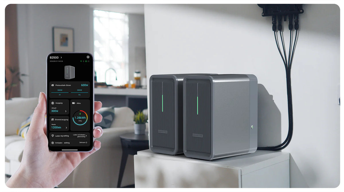 - 2×B2500 Batteriemodule – insgesamt 2240 Wh, 6000+ Zyklen, stapelbar bis zu 8960 Wh